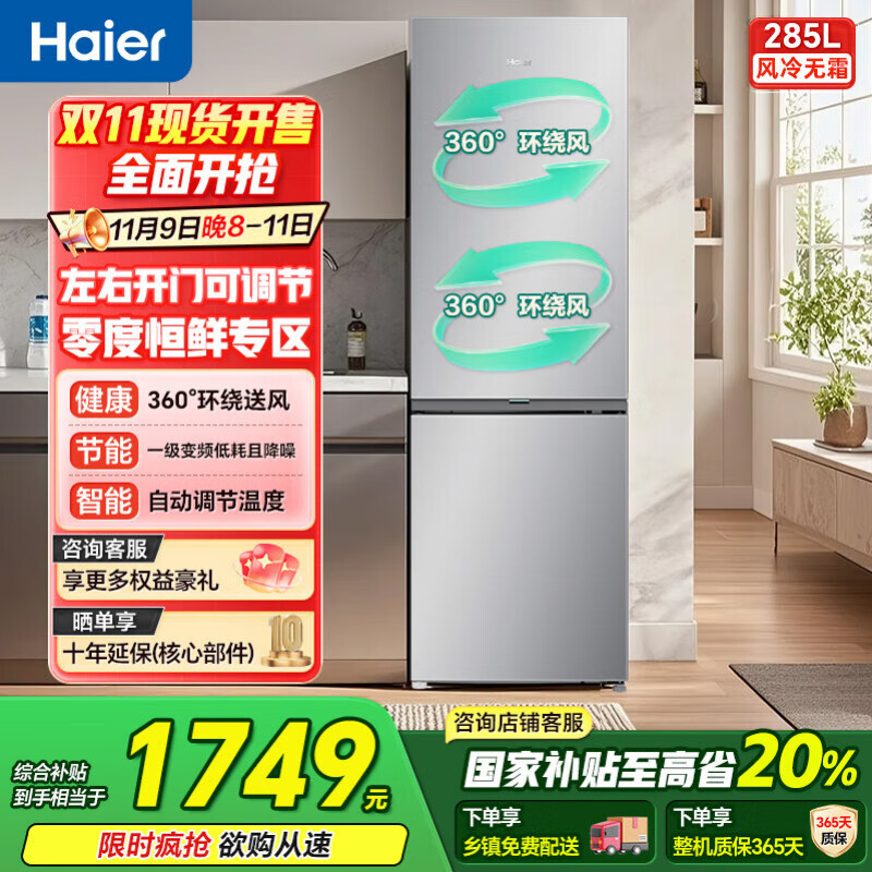 包邮 海尔冰箱285升283升两门三门双开门风冷无霜一级能效家用电器以旧换新电冰箱零度恒鲜左右换开门 285升双门风冷无霜左右开门